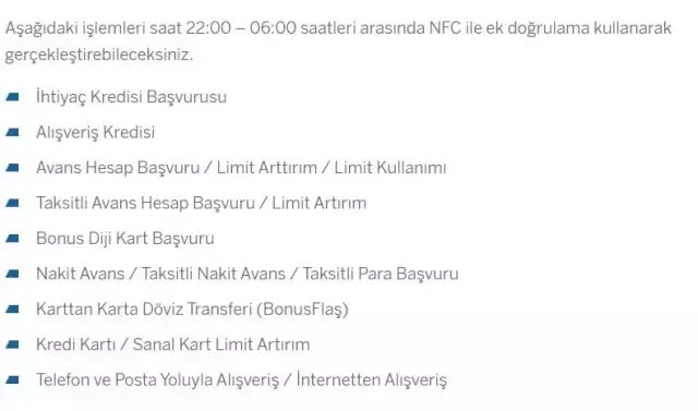 Bankaların internet sitelerinde yayımladığı duyurulara göre, saat 22.00 ile 06.00 arasında gerçekleştirilecek yüklü para transferi, nakit avans ve internet alışverişi gibi işlemlerde NFC onayı zorunlu olacak. Özellikle 20 bin TL ve üzerindeki para transferlerinde kimlik kartı ile NFC doğrulaması şart koşulacak.
