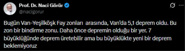 “Bugün Van-Yeşilköşk fay zonları arasında, Van’da 5,1 deprem oldu. Bu zon bir bindirme zonu. Daha önce depremin olduğu bir yer. 7 büyüklüğünde deprem üretebilir ama bu büyüklükte yeni bir deprem beklemiyoruz.”